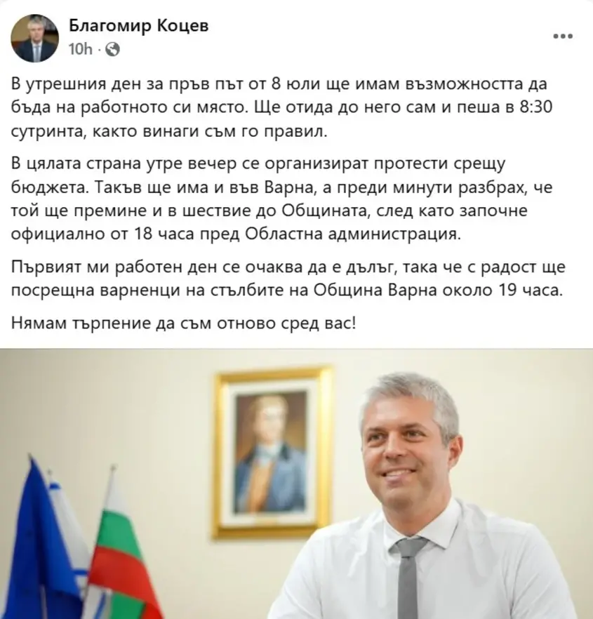 Във Facebook страницата си варненският кмет написа, че за първи път от 8 юли ще отиде на работа — “пеша в 8:30 сутринта, както винаги съм го правил”.