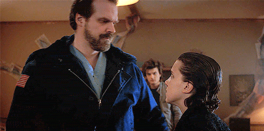 Героят на Дейвид Харбър - полицаят Джим Хопър - е един от най-важните образи на "възрастните" в сериала. Ветеран от войната, изгубил родната си дъщеря, той става истински баща на Елевън, пази я и я възпитава като собствено дете.