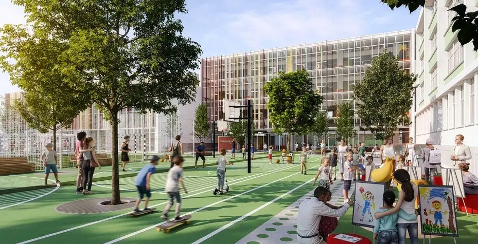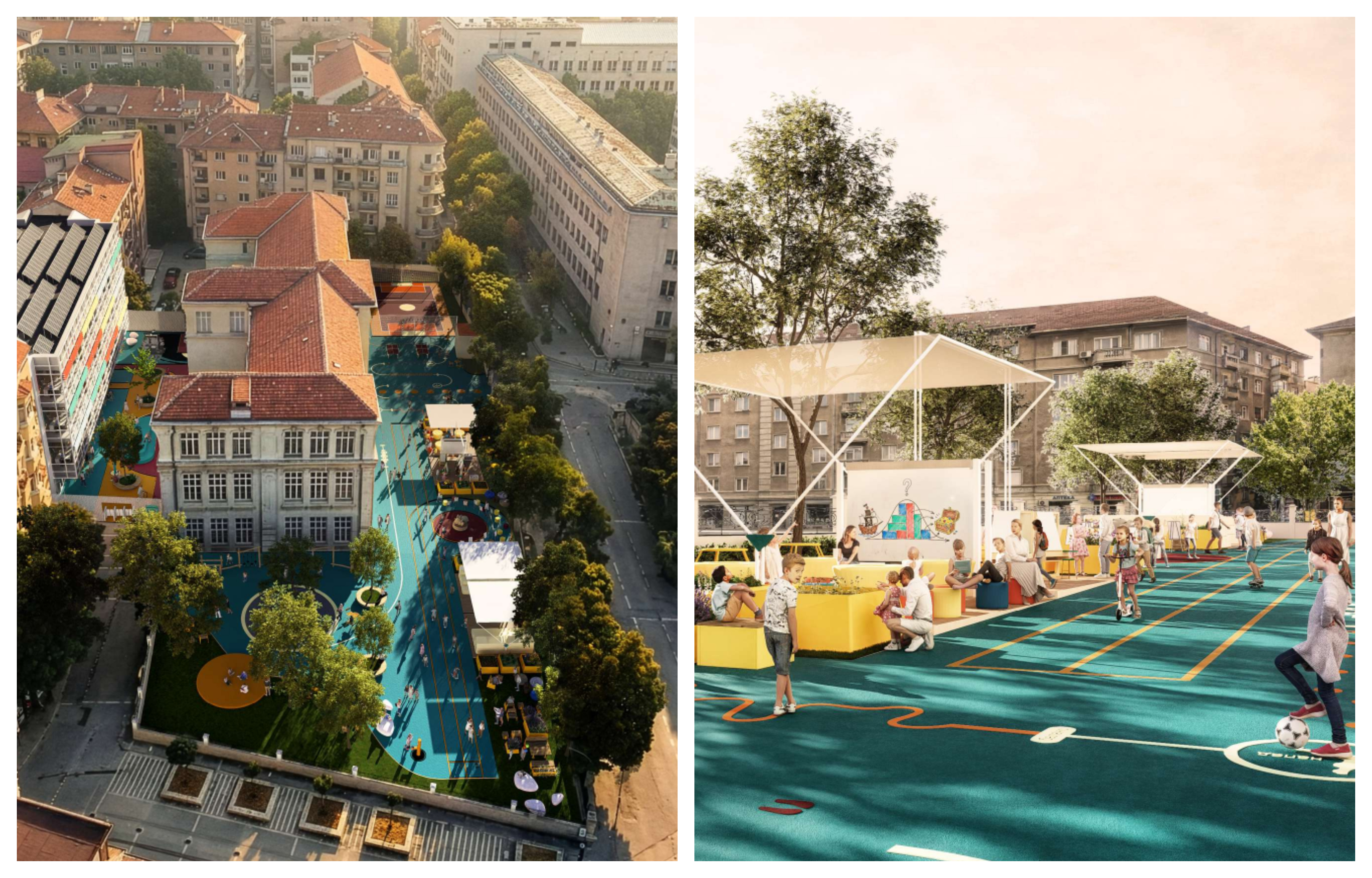 Проектът за обновяването на училището предвижда не само разширяване с нов корпус, но и преустройство на двора с повече зелени площи, места за почивка, игра и занимания на открито, включително възможности за уроци навън и за творчески дейности като рисуване.