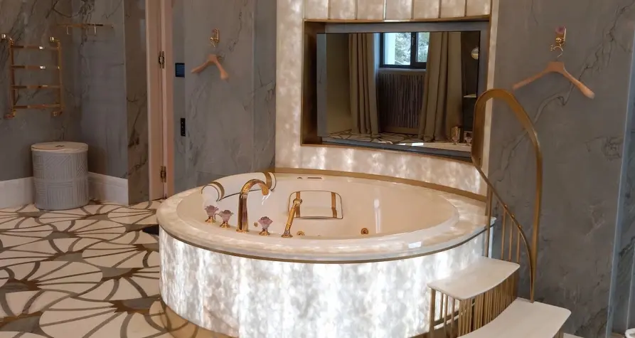 В банята има джакузи със златни смесители за вода и кранчета във формата на розички. Само златните елементи и розичките струват 60 000 лева.