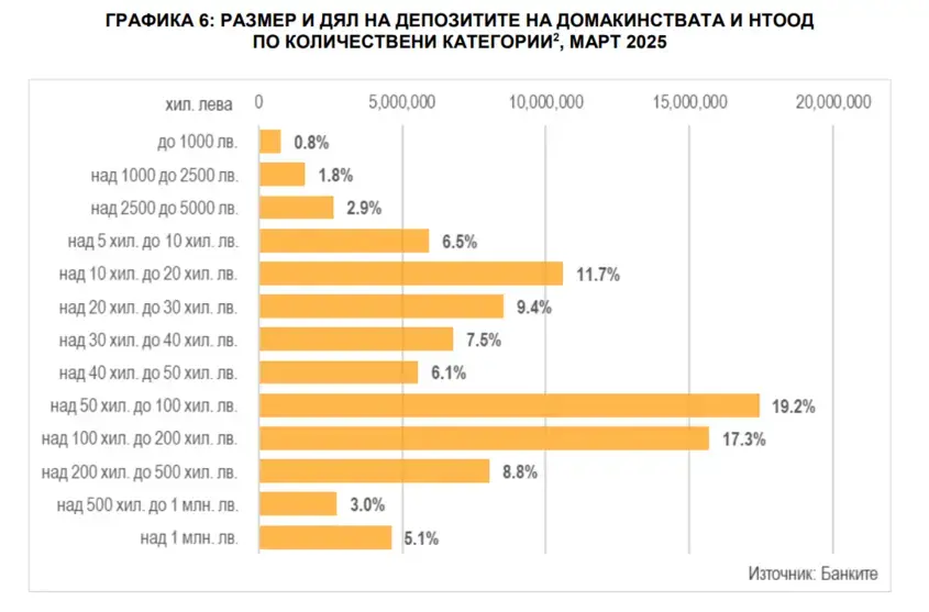 Най-много на брой са депозитите на домакинствата със суми между 50 и 100 хиляди лева, като техният дяла е малко над 19%.