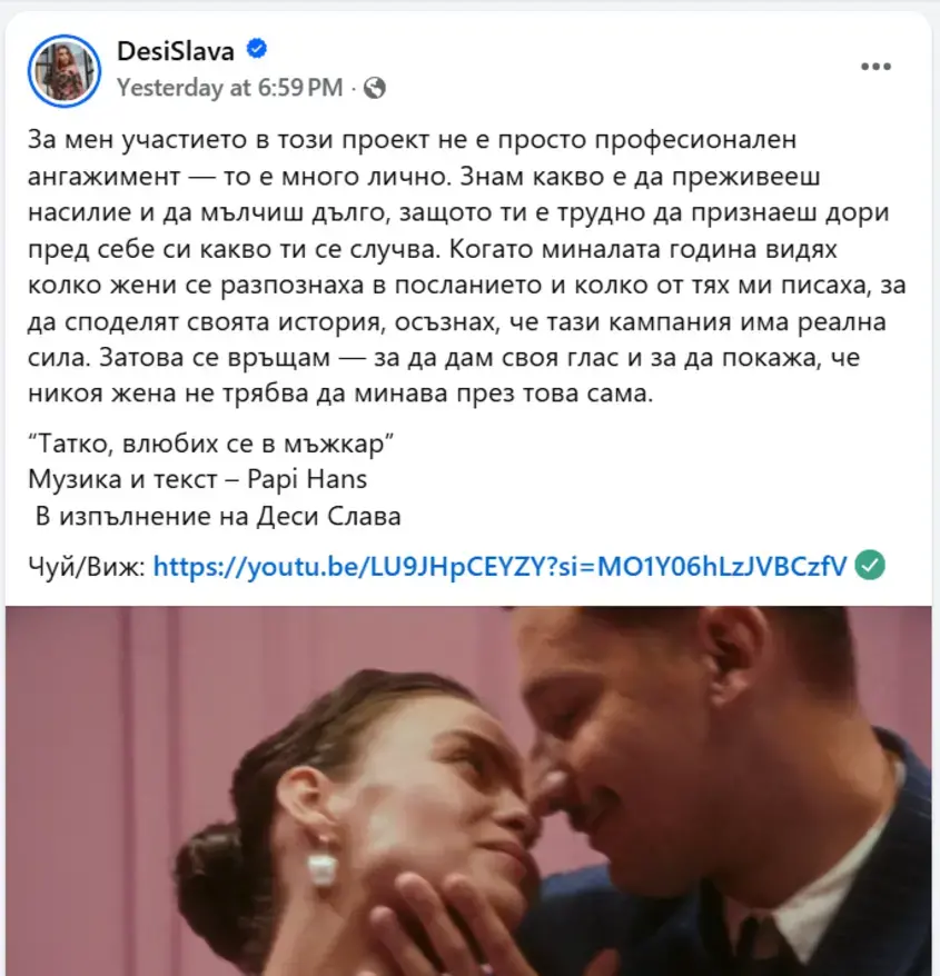 „Когато миналата година видях колко жени се разпознаха в посланието и колко от тях ми писаха, за да споделят своята история, осъзнах, че тази кампания има реална сила. Затова се връщам — за да дам своя глас и за да покажа, че никоя жена не трябва да минава през това сама“, написа Деси Слава.