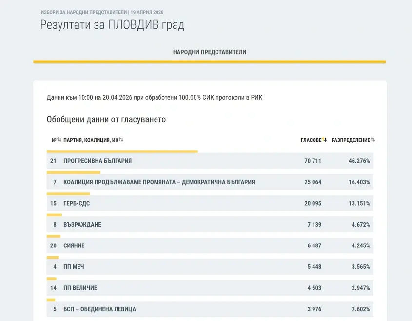 ГЕРБ са получили едва 20 095 гласа в подкрепа или 13,15% от вота, показват данните на ЦИК при 100% обработени протоколи.