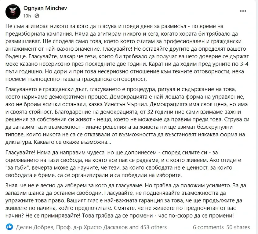 "На изборите утре ще гласувам по съвест, за личности с морал и каузи, които водят битки за нас и вместо нас, срещу политическата мерзост и държавното разграбване, личности с ум, сърце и кураж. Ще гласувам за кандидати, които познавам лично или съм опознал през техни дела и послания в рамките на политически програми, които ще отстояват личния си интегритет и няма да позволят да бъдат използвани и въвлечени в политическа корупция и аморални каузи."