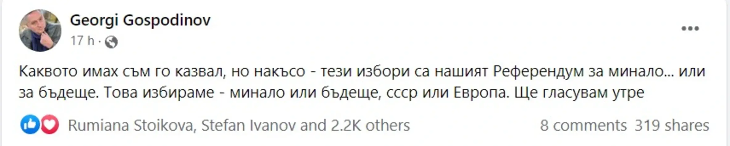 "Tези избори са нашият Референдум за минало... или за бъдеще. Това избираме - минало или бъдеще, ссср или Европа", написа в профила си във Facebook писателят Георги Господинов.