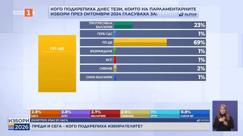 Една пета от гласувалите за ГЕРБ през 2024 г. също са изневерили на досегашния си избор и са дали гласа си за "Прогресивна България", въпреки че двете партии - поне на риторика - са основни противници.