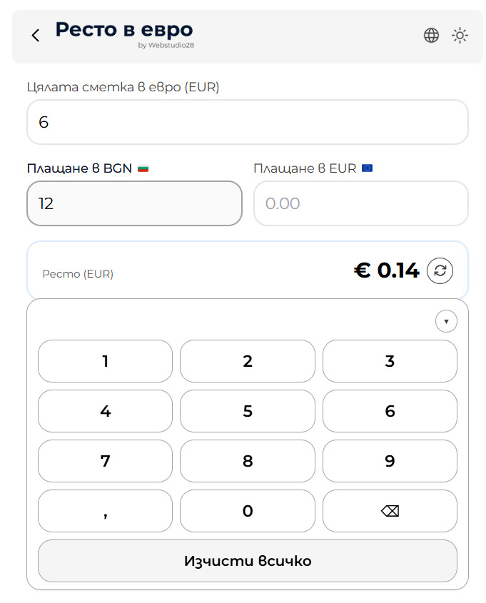 Калкулаторът показва дали сумата е достатъчна недостатъчна (колко трябва да се доплати в лева/евро), точна (няма ресто) или е по-голяма от цената (т.е. колко е рестото в евро).