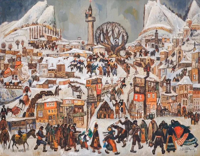 Платното разгръща многопластова панорама на зимата в Родопите, в която сватбени шествия и сцени от ежедневието се преплитат в жив образ на общност, движение и традиция.