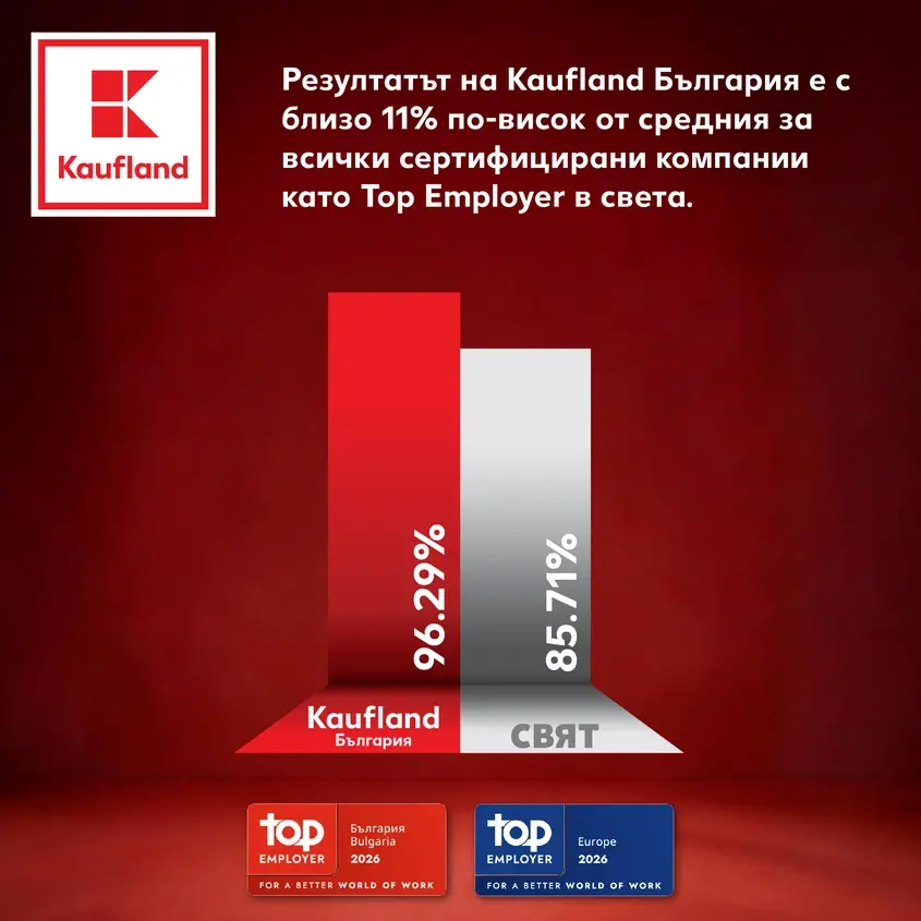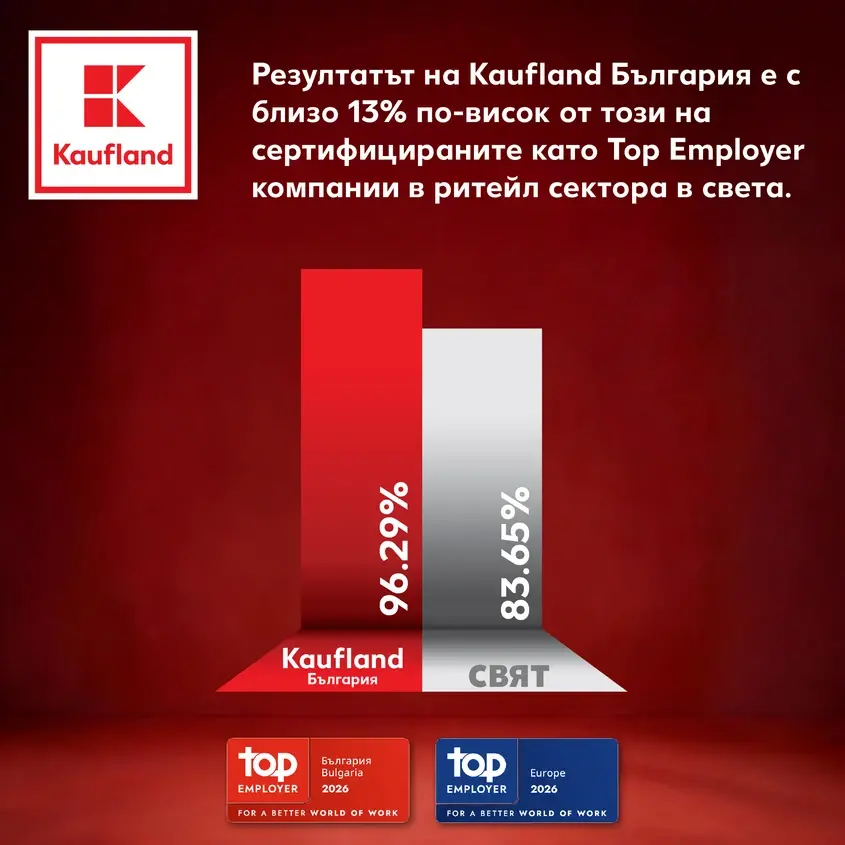 Kaufland България затвърди лидерската си позиция като работодател №1 в ритейл сектора у нас. Компанията заслужи за осма поредна година престижния сертификат Top Employer от независимия Top Employers Institute, като през 2026 г. постигна своя най-висок до момента общ резултат от 96,29%.