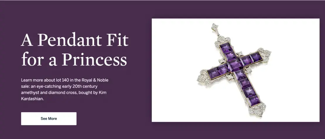 Най-интересен - поне за медиите, беше артикул 140. Кръст с аметист и диаманти, носен няколко пъти от лейди Даяна. Още по-любопитен е купувачът на бижуто - риалити звездата Ким Кардашиян.