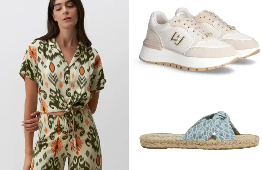Монохромните дънки незабавно ни тласкат към нещо по-разчупено за горната част и затова се спираме на ленената блуза с къси ръкави на Jimmy Key. Яркият мотив от зелено, бежово и оранжево, в комбинация с късата дължина и лека материя, я правят супер допълнение към деним панталоните. А ако сте привърженици на комплектите панталони и блузка, има и ленен панталон с широки крачоли от същата серия.