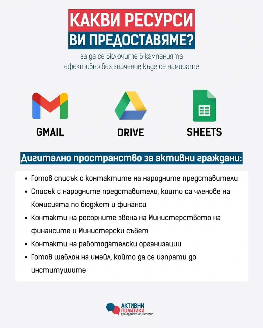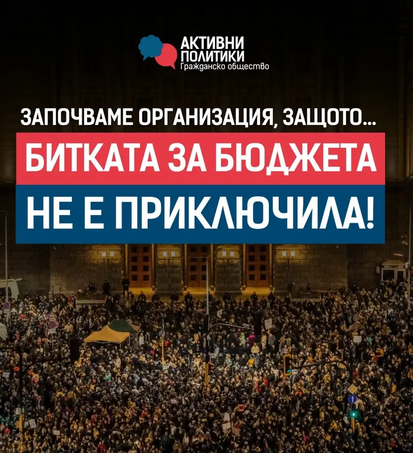 По време на протестите срещу Бюджет 2026 от "Активни политики" целенасочено се включват с кампания, започваща с публикация за проблемите в бюджета, последвана от публикация с решения, събрани от различни сектори. След като не получават отговор от управляващите - въпреки изпратените стотици имейли от последователи и опити за диалог - от организацията решават да подкрепят протестите и излизат на площада.