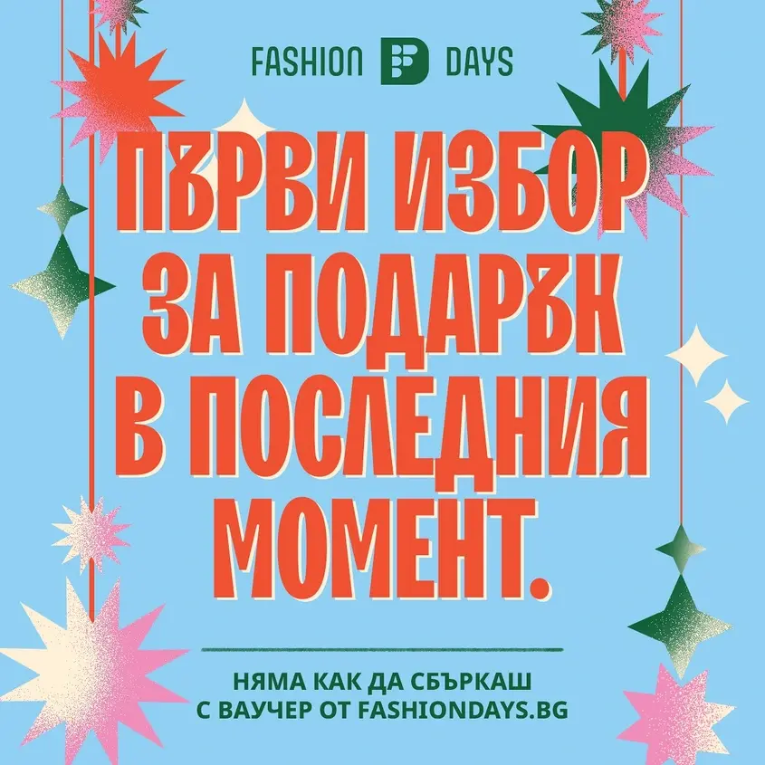 Вече 8 години Fashion Days скъсява разстоянието между модата и тези, които мечтаят да изглеждат добре, като ни напомня да не следваме сляпо тенденции и да не се страхуваме да показваме собствения си стил. Изберете ваучер за подарък за стойност по ваш избор и получателят може да го използва, за да освежи гардероба си с дрехи, обувки, аксесоари, чанта, часовник или бижу по свой избор.