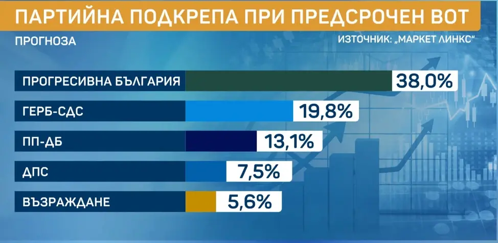 Изчислено в мандати - прогнозите са 109 депутати за "Прогресивна България", 57 за ГЕРБ-СДС, 37 за ПП-ДБ, 21 за ДПС-НН и 16 за "Възраждане".