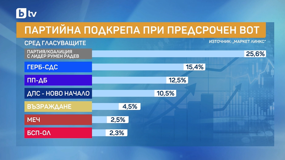 Това са изводите в първото изследване на "Маркет линкс" за предизборните настроения, което измерва подкрепата за бъдеща формация на Румен Радев в парламенарния вот. Изследването е проведено за bTV между 7 и 13 февруари 2026 г.