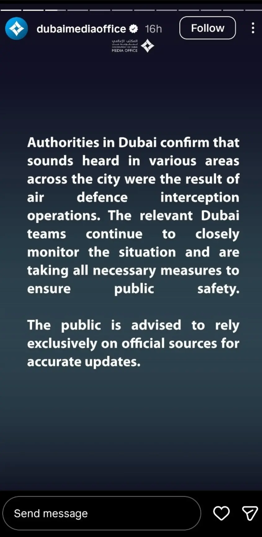 В същото време в социалните мрежи започнаха да се разпространяват видеа, на които се виждат президентът на Обединените арабски емирства Мохамед бин Зайед и шейхът на Дубай Мохамед бин Рашид ал Мактум, които спокойно пият кафе в мол в Дубай – жест, който мнозина тълкуваха като внимателно премерен сигнал, че ситуацията е спокойна и под контрол.