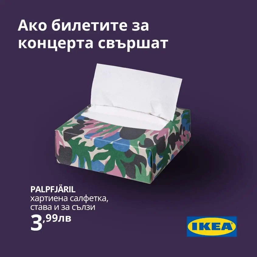 ,,Всеки, който не успее да си вземе билет, ще открие над 25 700 хартиени салфетки PALPFJÄRIL в магазини ИКЕА или на IKEA.bg", написа бранда в социалните мрежи с остроумната визия.