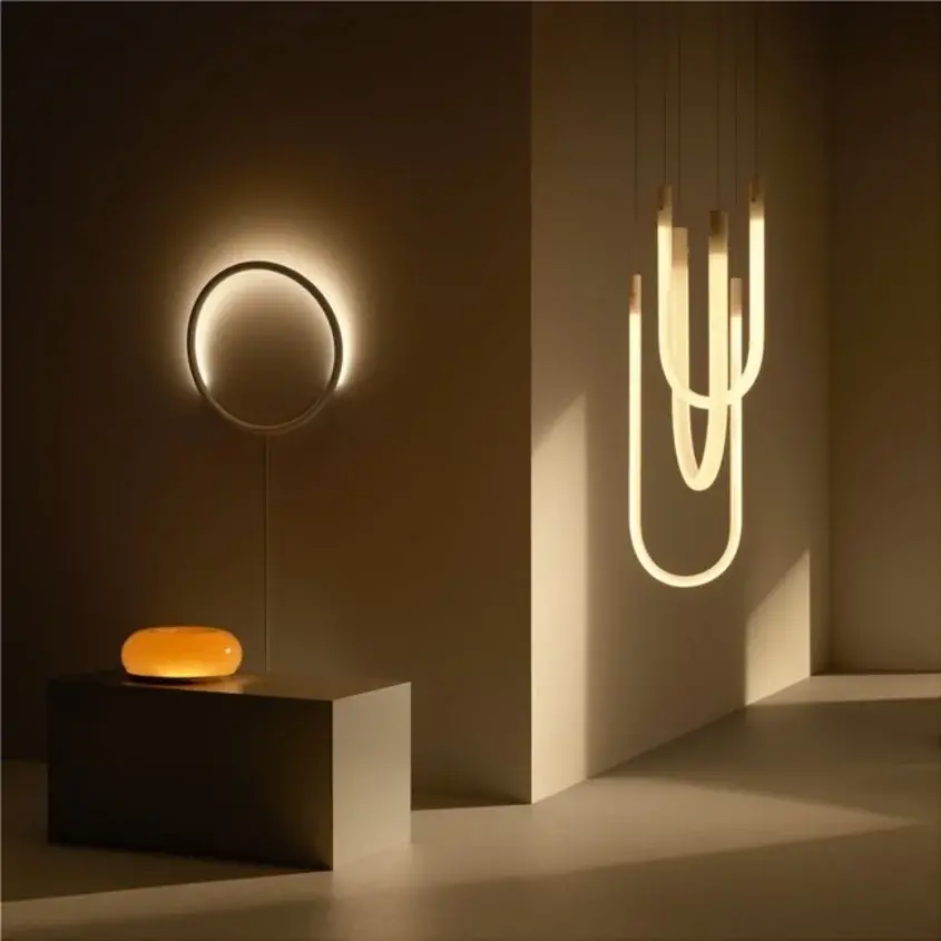 В колекцията има и висящ модел, който се фокусира върху нюансите на бялата светлина – от хладна дневна до топло, жълтеникаво сияние.