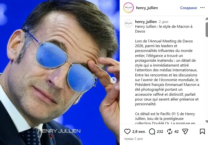 Става дума за италианската iVision Tech – собственик на френската марка Henry Jullien, чиито очила Макрон носеше в швейцарските Алпи. Само за няколко часа компанията добави около 4,1 млн. долара към капиталите си, а интересът към бранда буквално „счупи“ сайта му.