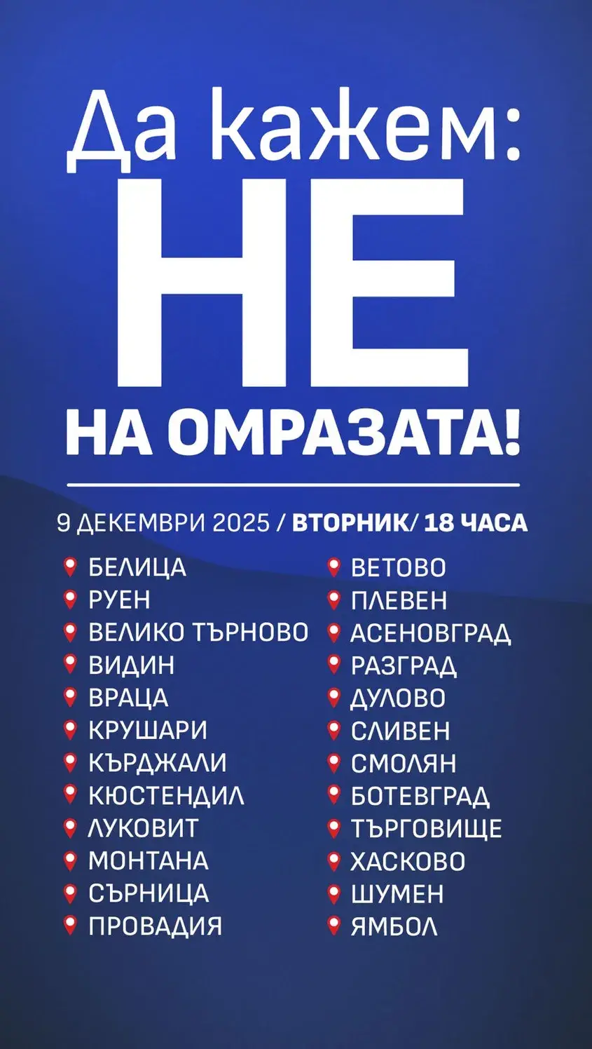 Митинги ще има в Белица, Руен, Провадия, Велико Търново, Видин, Враца, Крушари, Кърджали, Кюстендил, Луковит, Монтана, Сърница, Плевен, Асеновград, Разград, Ветово, Дулово, Сливен, Смолян, Ботевград, Търговище, Хасково, Шумен и Ямбол.