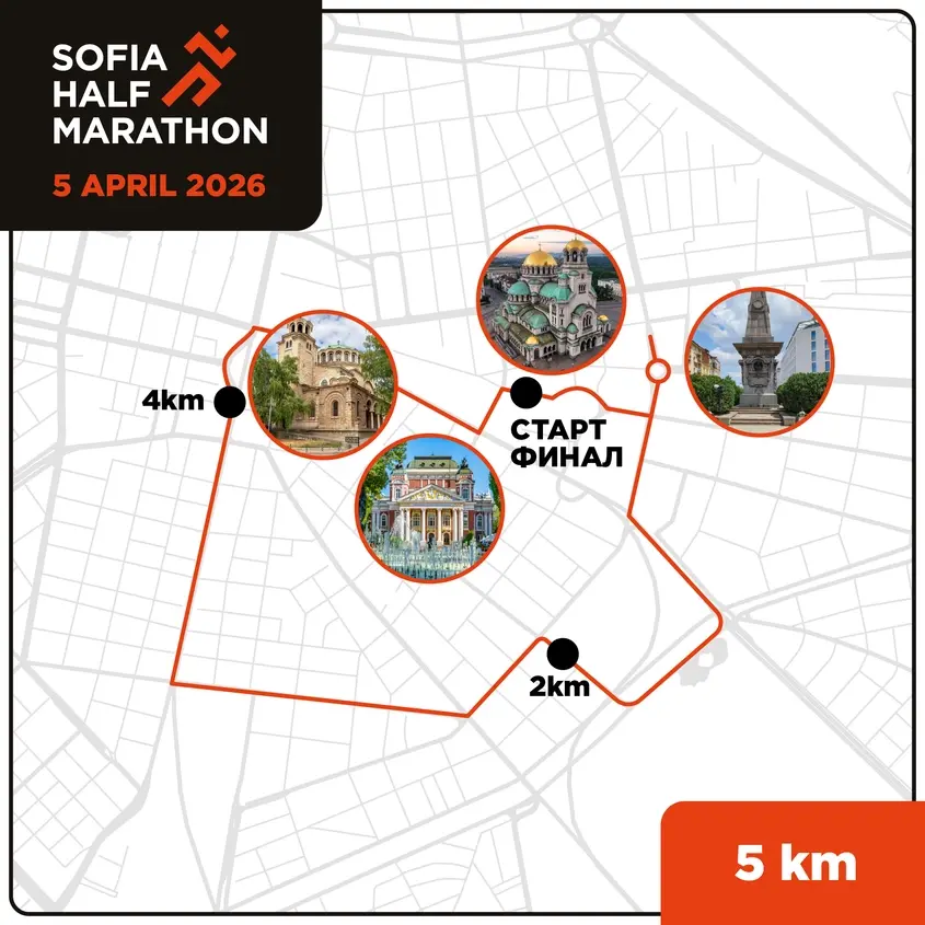• Първото е с дължина 5 км и започва в 9:10 ч. от площад „Св. Александър Невски“. То преминава покрай Софийския университет „Св. Климент Охридски“, „Орлов мост“, ул. „Гурко“, бул. „Патриарх Евтимий“, бул. „Витоша“, църквата „Св. Неделя“ и бул. „Цар Освободител“, като финалът е пред катедралата.