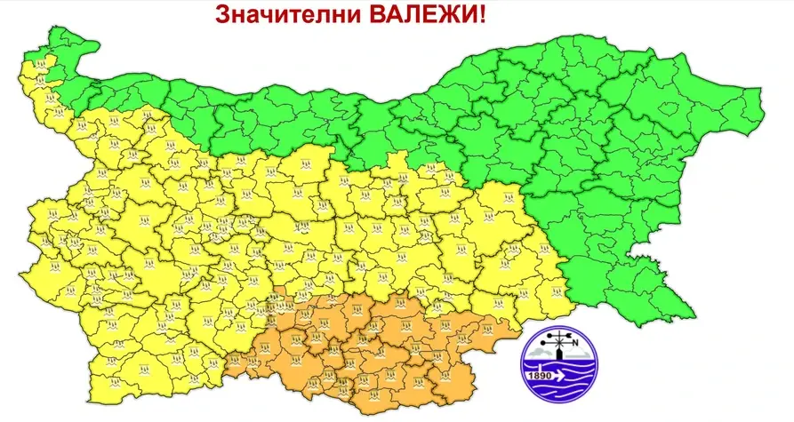 Жълт код е обявен за Видин, Монтана, Враца, Ловеч, Габрово, Велико Търново, Сливен, Ямбол, Стара Загора, Пазарджик, София-област, София-град, Перник, Кюстендил и Благоевград.