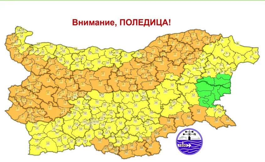 Оранжев код за поледици, сняг и дъжд е издаден за 19 области - Силистра, Разград, Шумен, Търговище, Русе, Велико Търново, Габрово, Ловеч, Враца, София-област, София, Монтана, Видин, Кюстендил, Перник, Смолян, Кърджали, Хасково, Бургас. За останалите е в сила жълт код, с изключение на някои общини във Варна и Бургас.