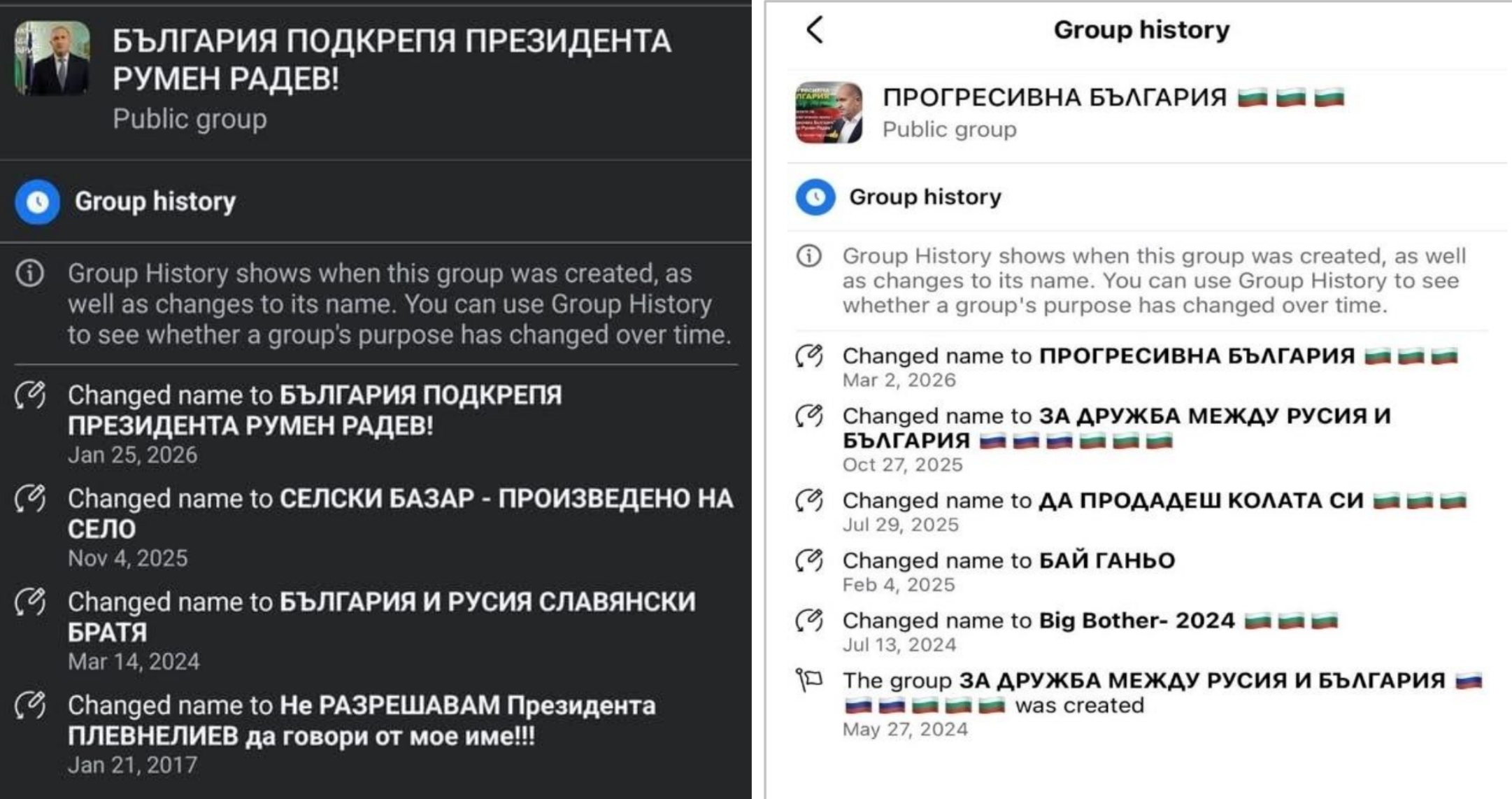 “Това включва придобиване или преобразуване на вече съществуващи страници и групи, създадени първоначално за други цели – търговски, културни или политически – в инструменти за предизборна кампания. Основен бенефициент на този модел е „Прогресивна България“. Групи, създадени около проруски теми или свързани с ИТН, са преименувани в подкрепа на Румен Радев, често в един и същи ден – което подсказва общ оператор”, пишат авторите на доклада.