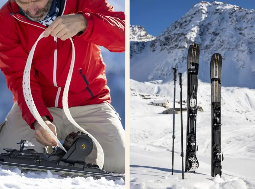 Под тази движеща се част първо се поставят ски кожи, познати още като кожи за катерене - елемент, използван и при стандартното изкачване със ски алпинизъм. Те се залепват за долната страна на ските и имат специални влакна, които позволяват плъзгане напред, но спират приплъзването назад.