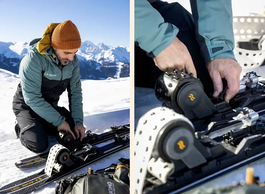 Когато изкачването приключи, моторите и батериите се откачат и се прибират в раница, отворите се затварят, а ските отново се използват като нормални ски за спускане. Звучи лесно? На практика системата е далеч по-сложна.