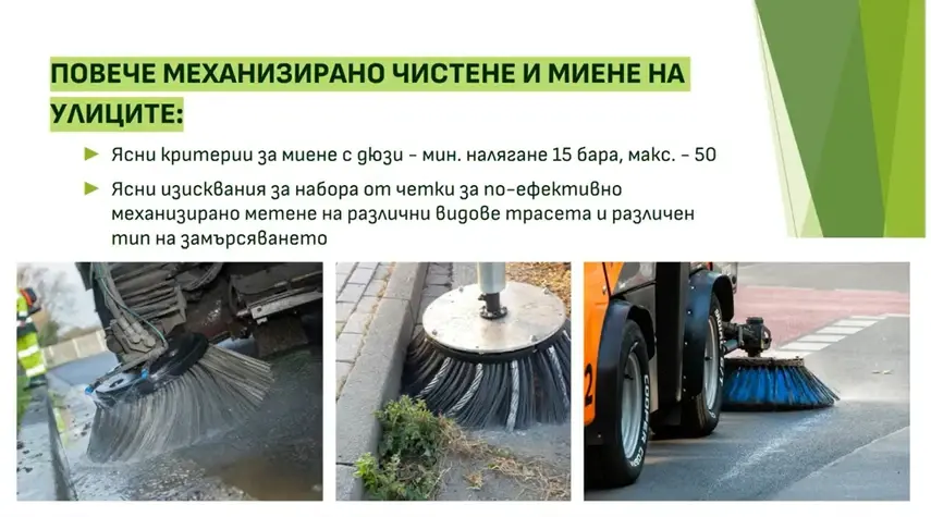 Последното се оказва голям проблем в София, защото често се използва водна струя с ниско налягане, която не отмива натрупания прах, а го превръща в кал. Затова и се въвеждат изисквания за минималната сила на водния поток, както и за машини, които да заменят ръчното метене на улиците с метли и чували. Ще се използват четки с налягане, за да няма само мокрене на улиците. Въвежда се и малогабаритна техника, която ще почиства тротоарите и малките улици.