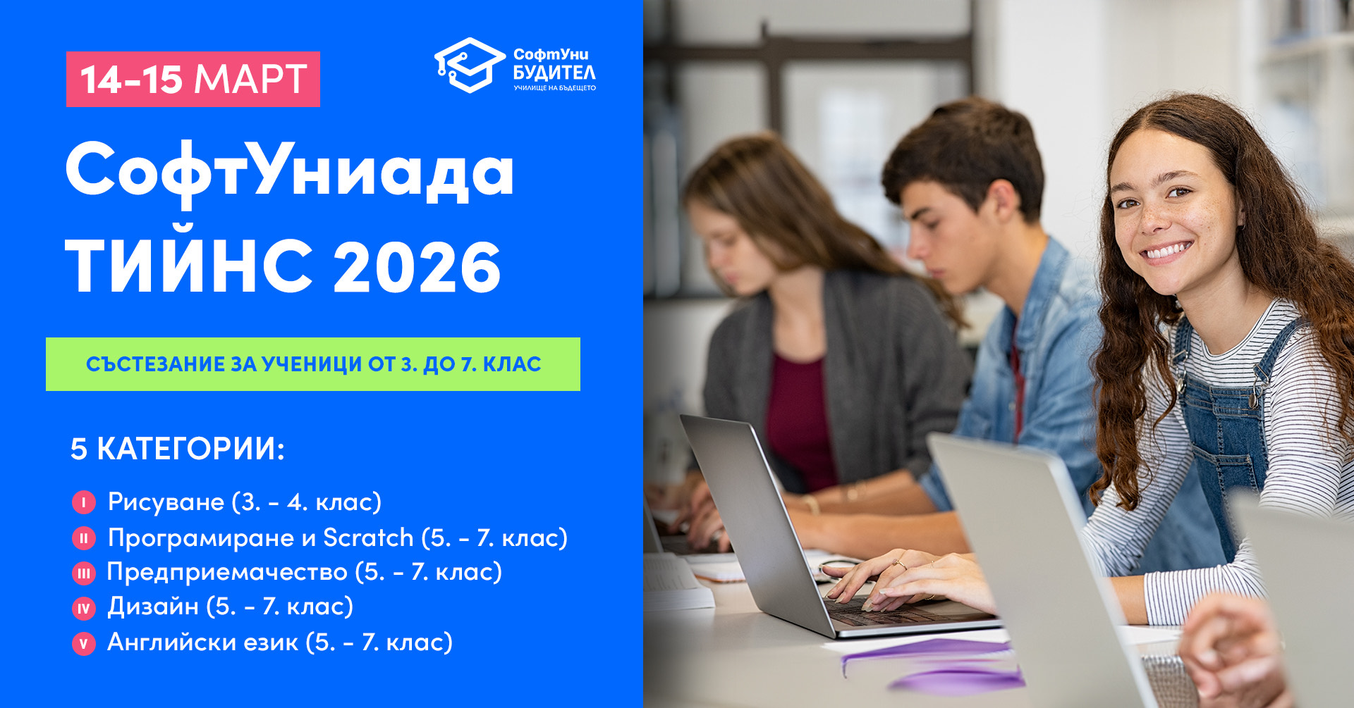 Частна гимназия за дигитални науки СофтУни БУДИТЕЛ с радост обявява откриването на СофтУниада ТИЙНС 2026 - национално ученическо състезание, което ще се проведе на 14 и 15 март 2026 г. в База Младост на СофтУни БУДИТЕЛ (бул. Александър Малинов № 78, София).