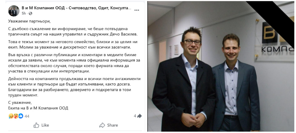 Смъртта на Дечо Василев беше официално потвърдена на Facebook страницата на счетоводната фирма, в която е съдружник и управител. Екипът му моли за уважение и дискретност към семейството и близките.