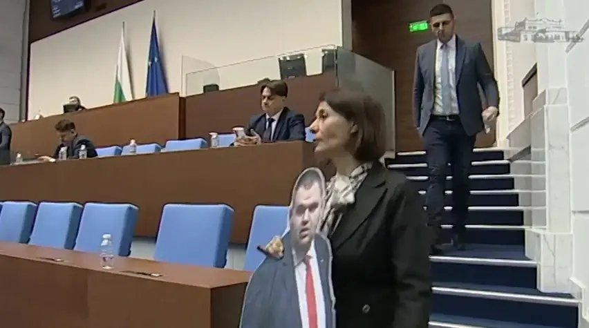 Той така и не се появи в залата, а опозицията разполжи на мястото на Делян Пеевски негова фигура от картон.