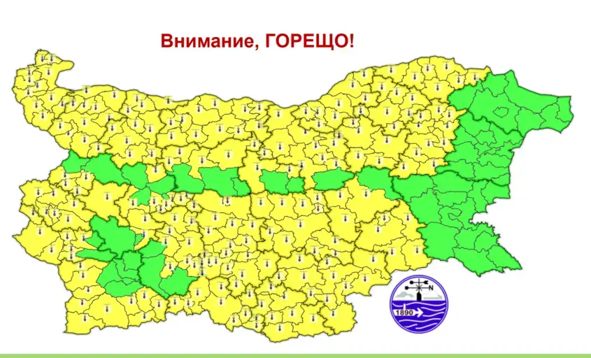 Предупреждението е в сила за почти цялата страна, с изключение на областите Бургас, Варна и Добрич, става ясно от прогнозата на Националния институт по метеорология и хидрология.