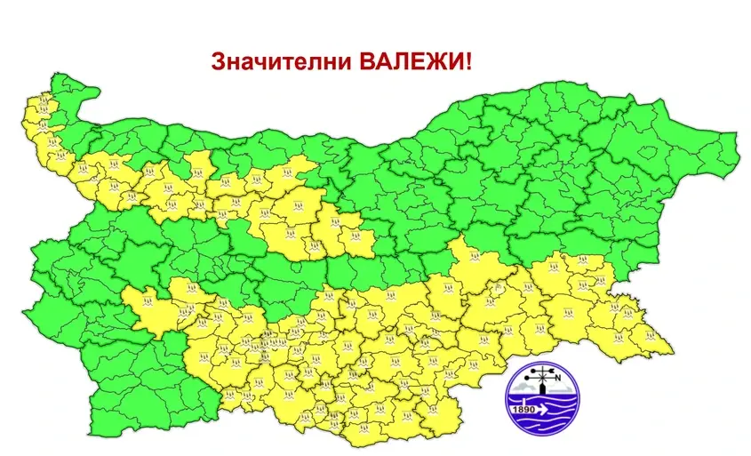Предупреждението за потенциално опасно време е в сила за Бургас, Видин, Враца, Габрово, Кърджали, Ловеч, Монтана, Пазарджик, Плевен, Пловдив, Сливен, Смолян, Стара Загора, София-област, Хасково и Ямбол.