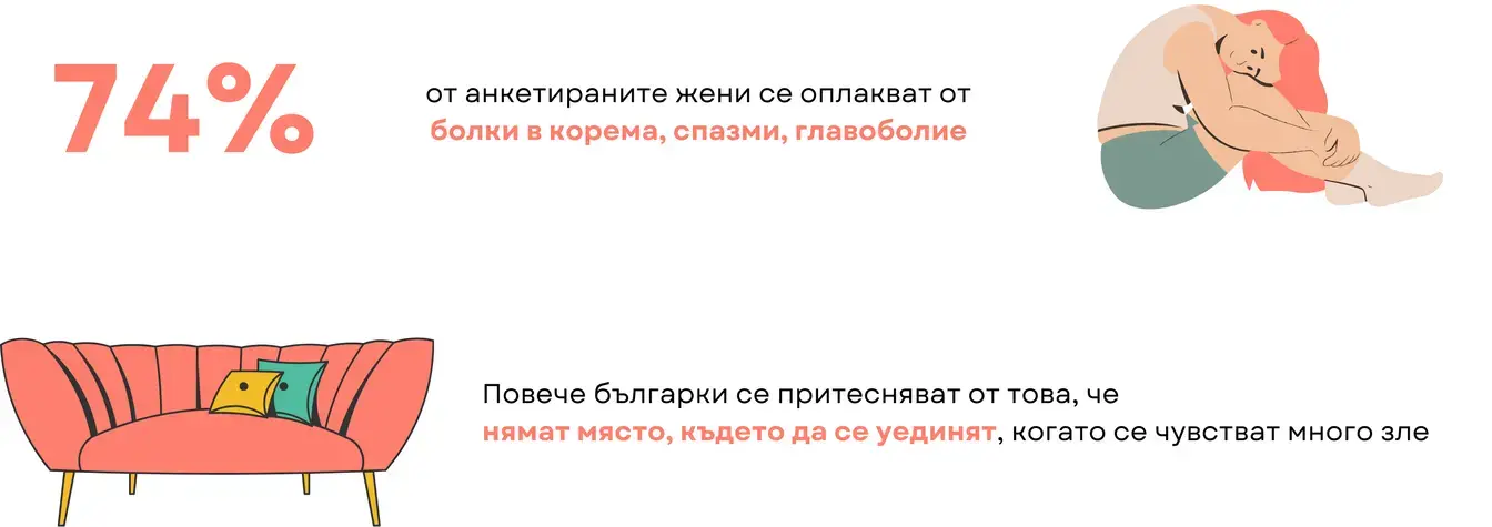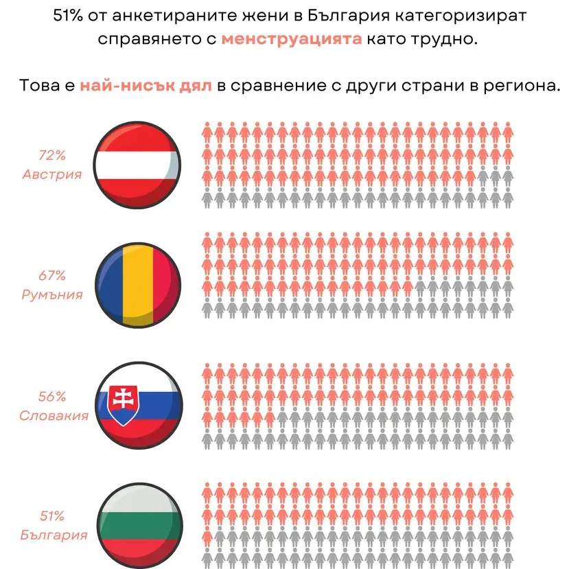 Фактът, че жените нямат място, където да се уединят, когато на публично място се почувстват зле по време на цикъла си, е по-силно изразен в България, спрямо страха от загуба на кръв, когато са навън. Това "претегляне" на тези два възможни фактора за дискомфорт не се среща сред респондентите в другите страни, участвали в проучването.