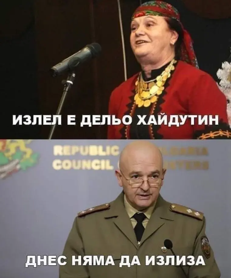 Ръководителят на българския НОЩ ген. Венцислав Мутафчийски се превърна в главен герой на фолклора в социалните мрежи по време на първата национална карантина. "Да не излиза" стана толкова популярна реплика, че българка, бременна в 39 седмица, написа шеговито писмо до началника на ВМА с молба да "разреши" на бебето й най-после да излезе.