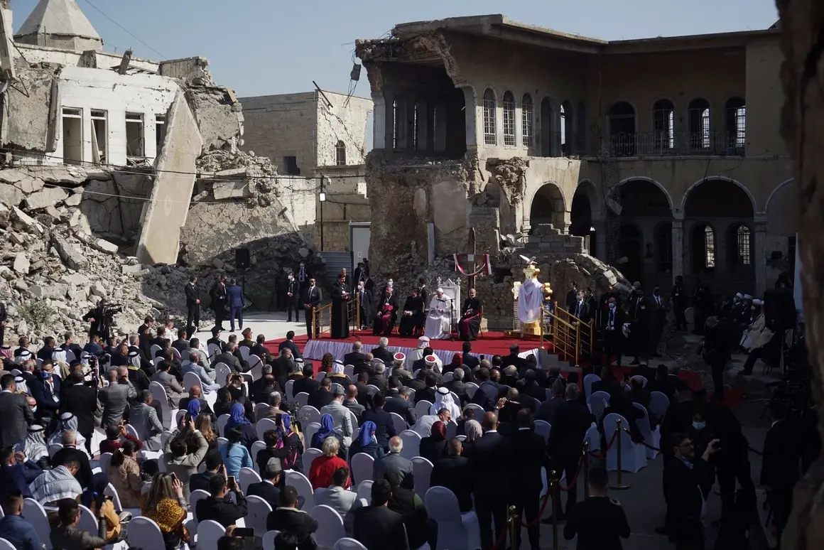 84-годишният папа Франциск се моли сред руините на град Мосул в Ирак по време на първото му посещение в страната. Папата се помоли за братството между всички различни религии в Ирак.