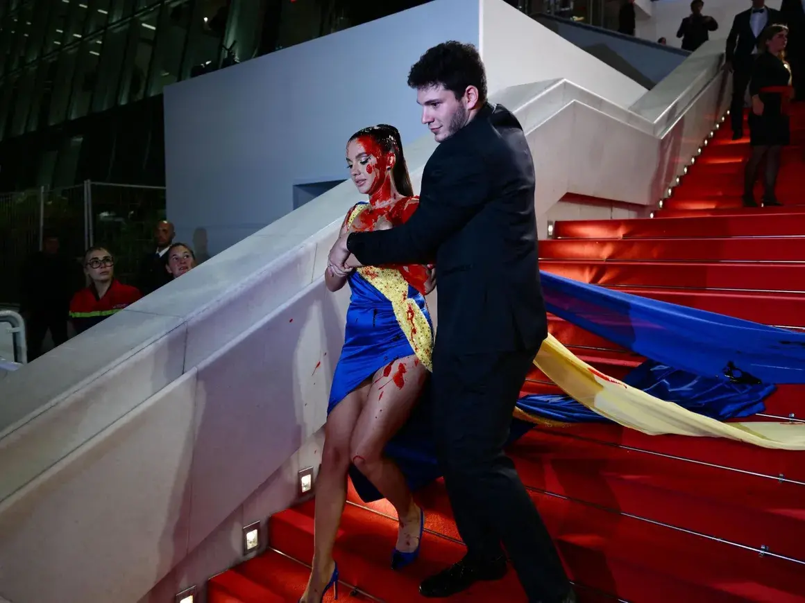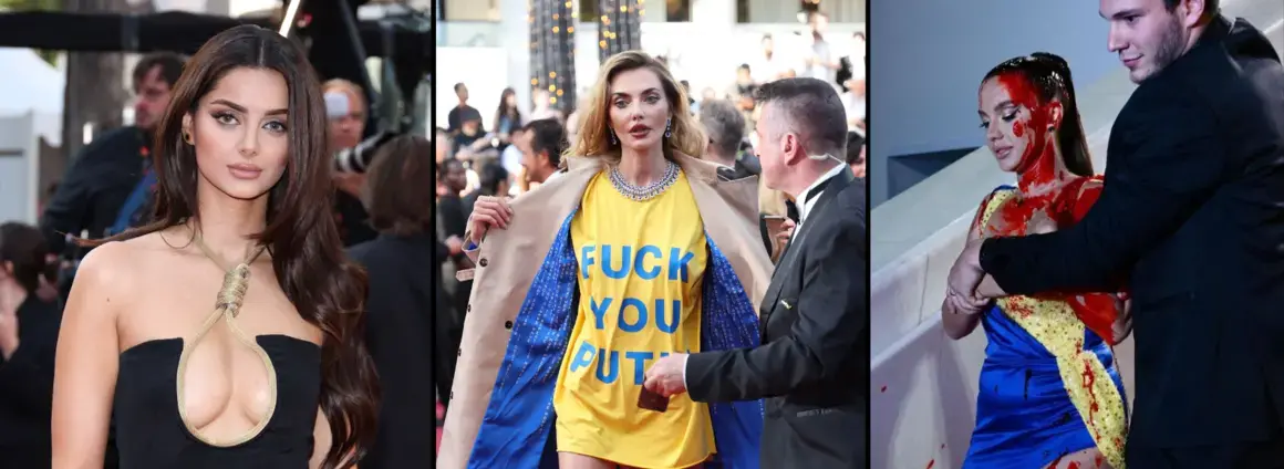Най-крещяща бе появата на украинския модел и фитнес инфлуенсър Илона Чернобай, която заля себе си с кървавочервена боя. Роклята ѝ с цветовете на родината направиха жестта максимално символичен.