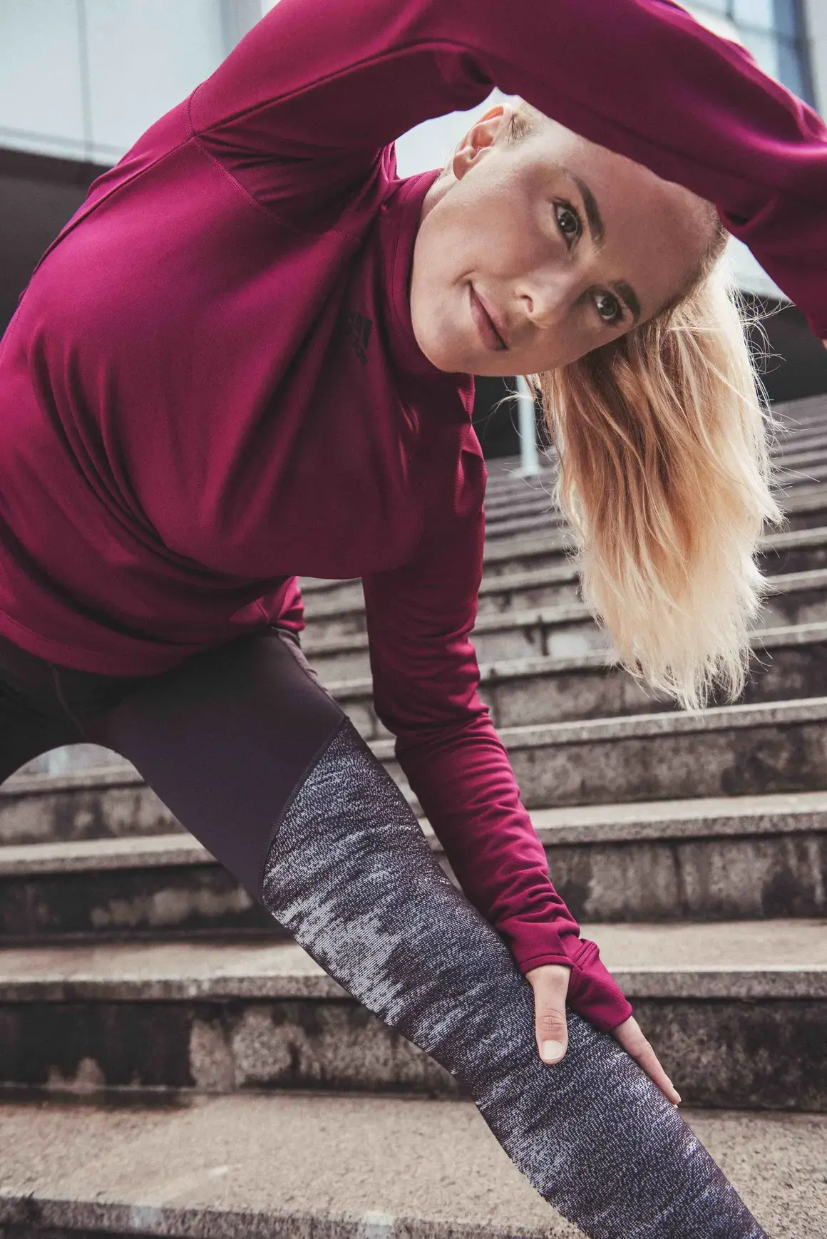 Надя Младенова, която не спира да бяга и в най-студените дни, и също така е един от капитаните на adidas Runners Sofia, е с блуза с висока яка. Моделът включва допълнителни ципове на джобовете и дупка за палеца на ръката и максимално покритие.
