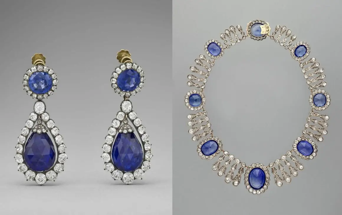 Обеците и огърлицата от комплекта със сапфирената корона.