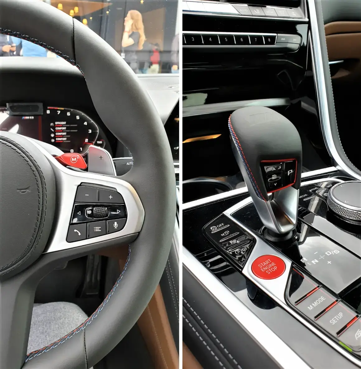 Характерни елементи за М Performance - волан с лостова за ръчно управление на скоростите и два бутона (червените) - за бързо извикване на предварително зададени настройки на окачването, спирачките, режима на смяна на скоростите, и др.