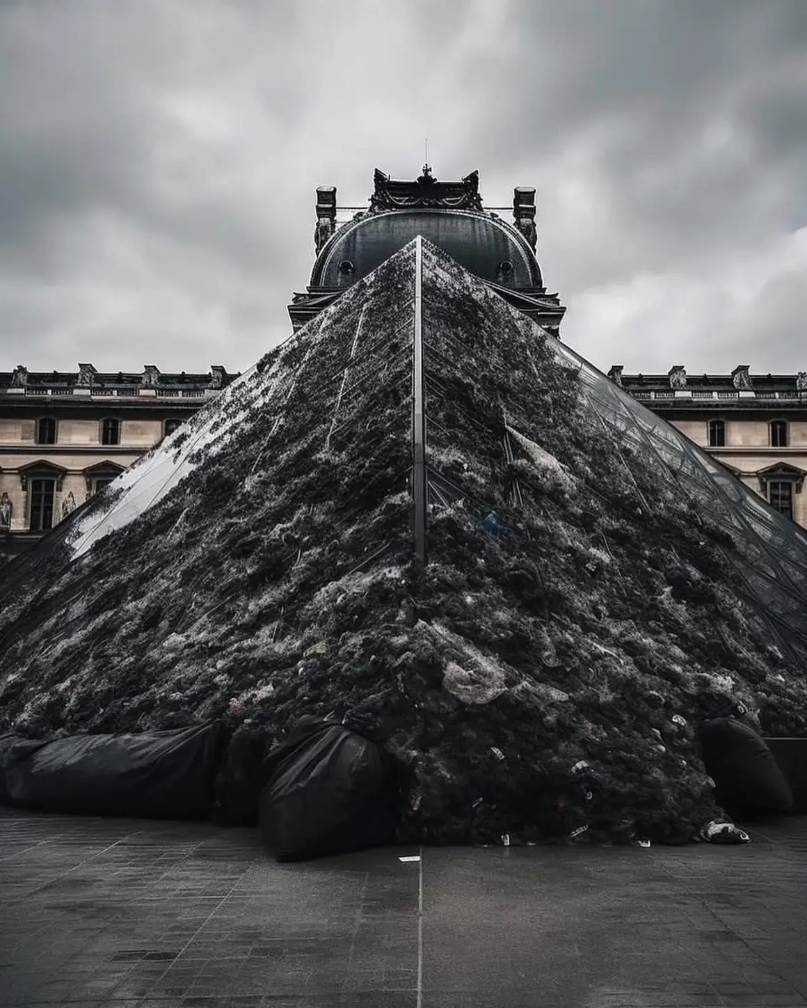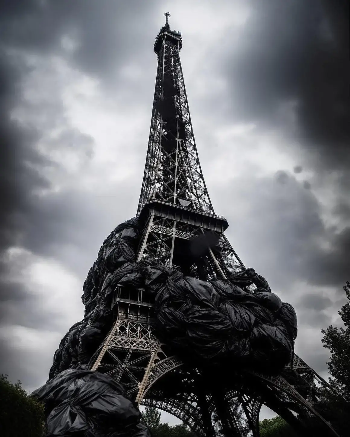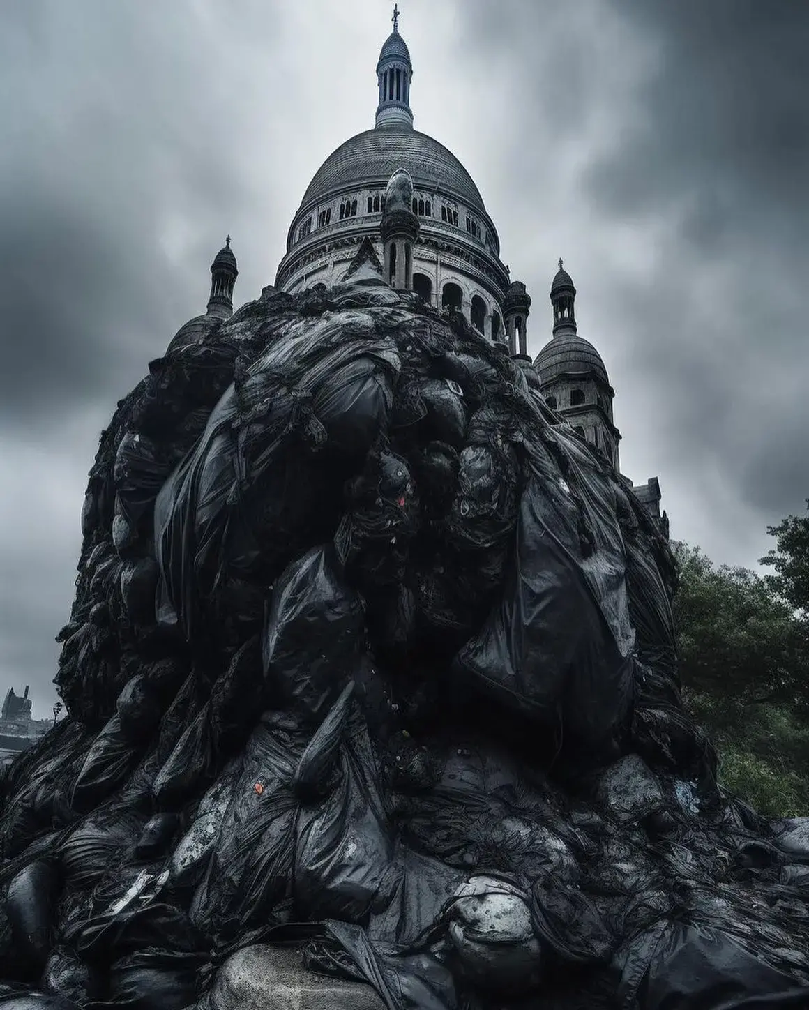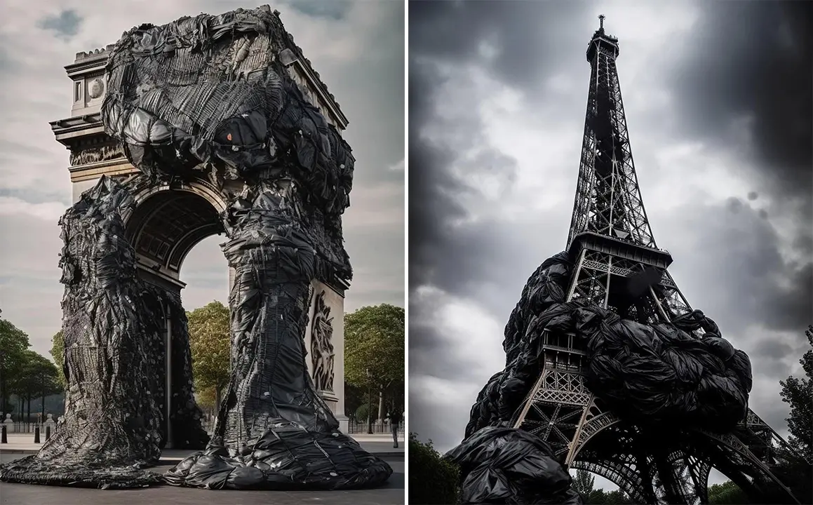 Артистът и AI ентусиаст Матю Гб си служи с изкуствения интелект за създаването на архитектурни пейзажи на най-известните забележителности в Париж, срастнали се с чували с боклук.