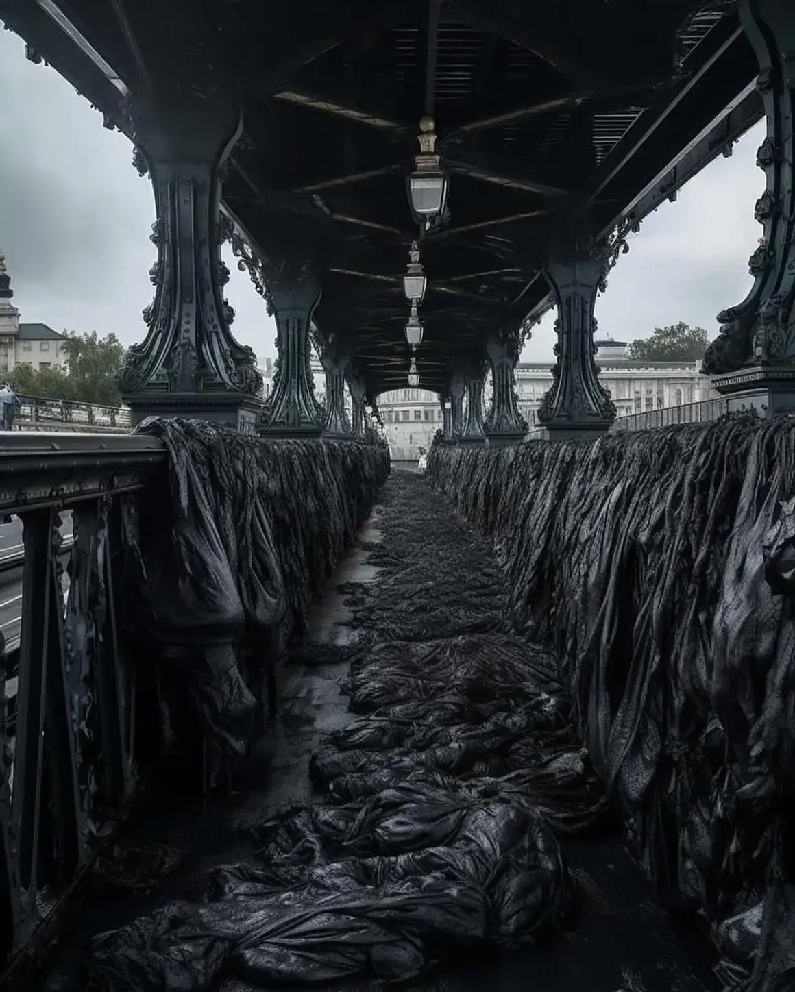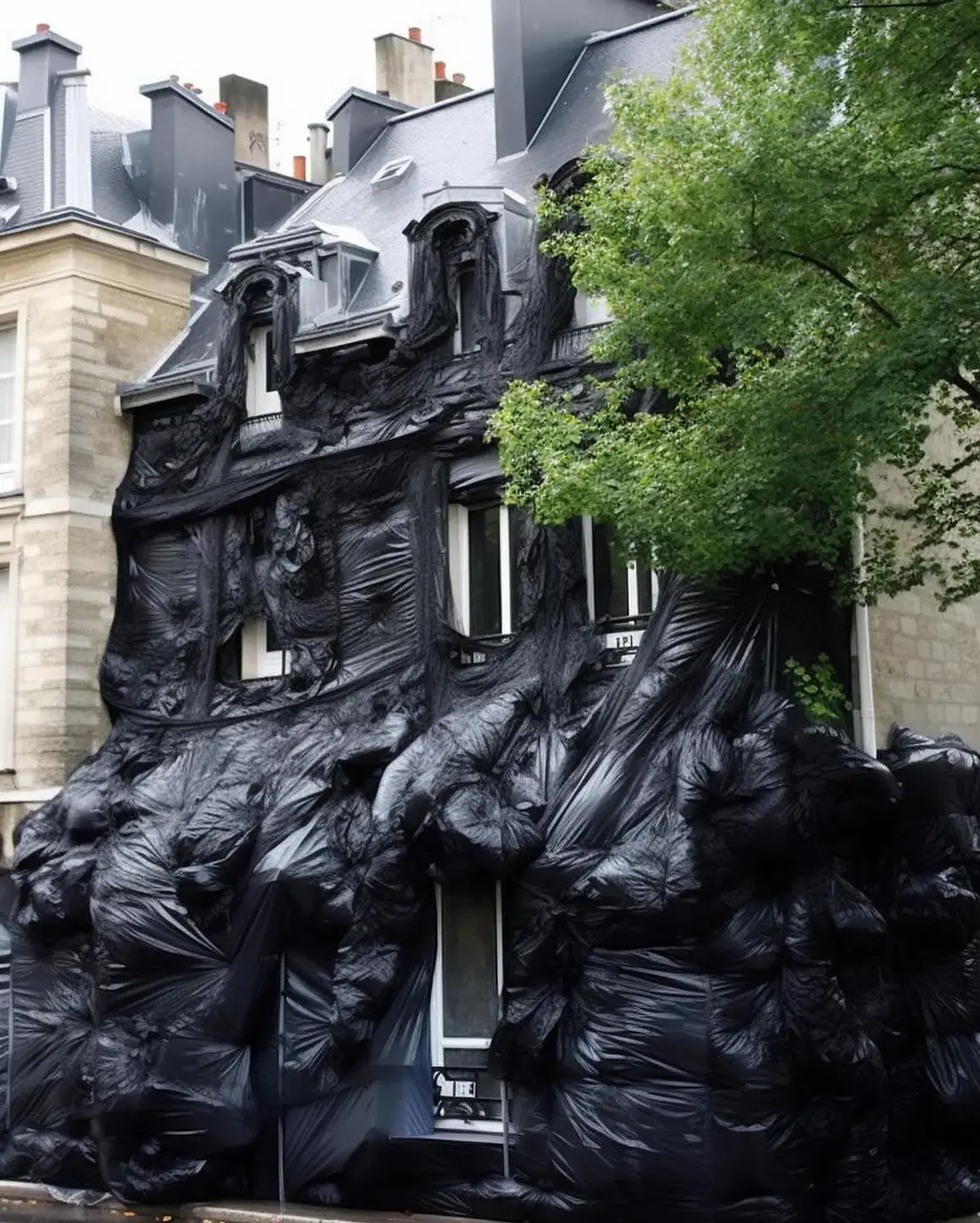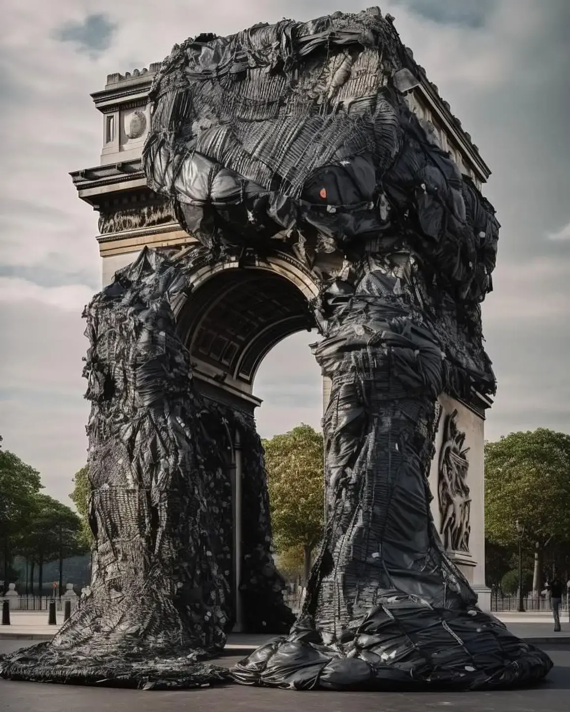 Артистът и AI ентусиаст Матю Гб си служи с изкуствения интелект за създаването на архитектурни пейзажи на най-известните забележителности в Париж, срастнали се с чували с боклук.