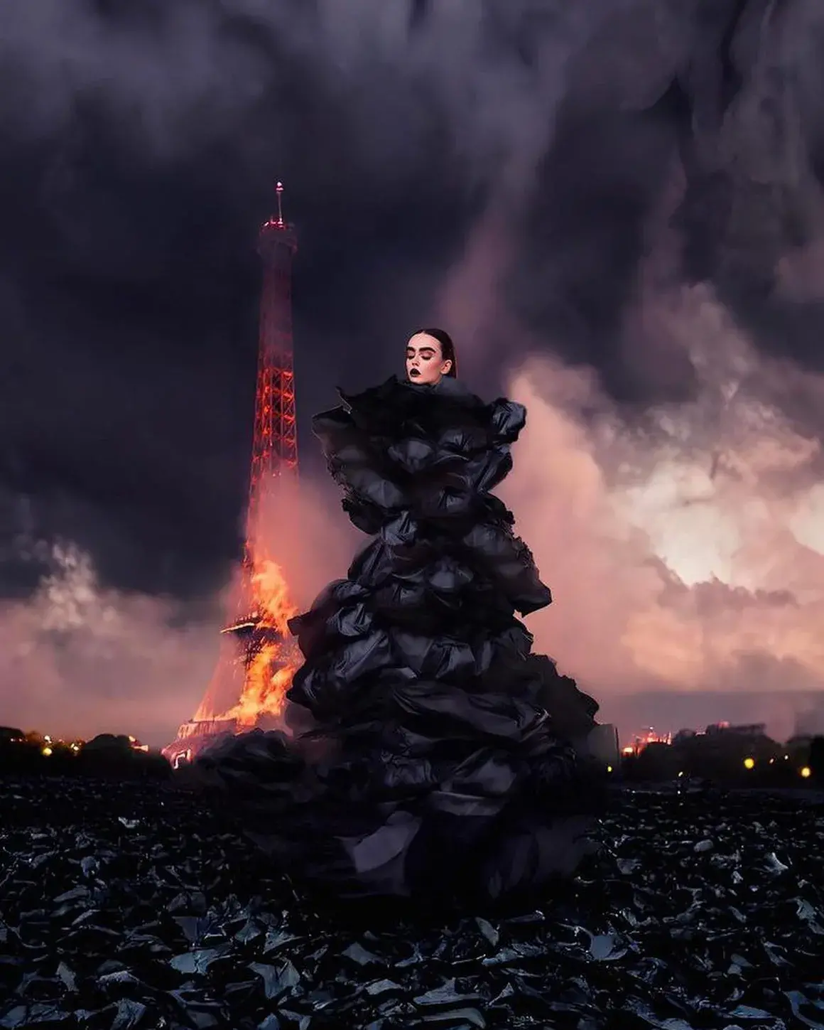 Серията произведения на парижанина включва и изображение на героинята Емили Куупър от сериала "Емили в Париж". Дигиталният артист се заиграва с любовта ѝ към облеклото, като изпраща Емили не на Седмицата на модата, а на Седмицата на боклука - заглавието на кадъра е "Paris Garbage Week".