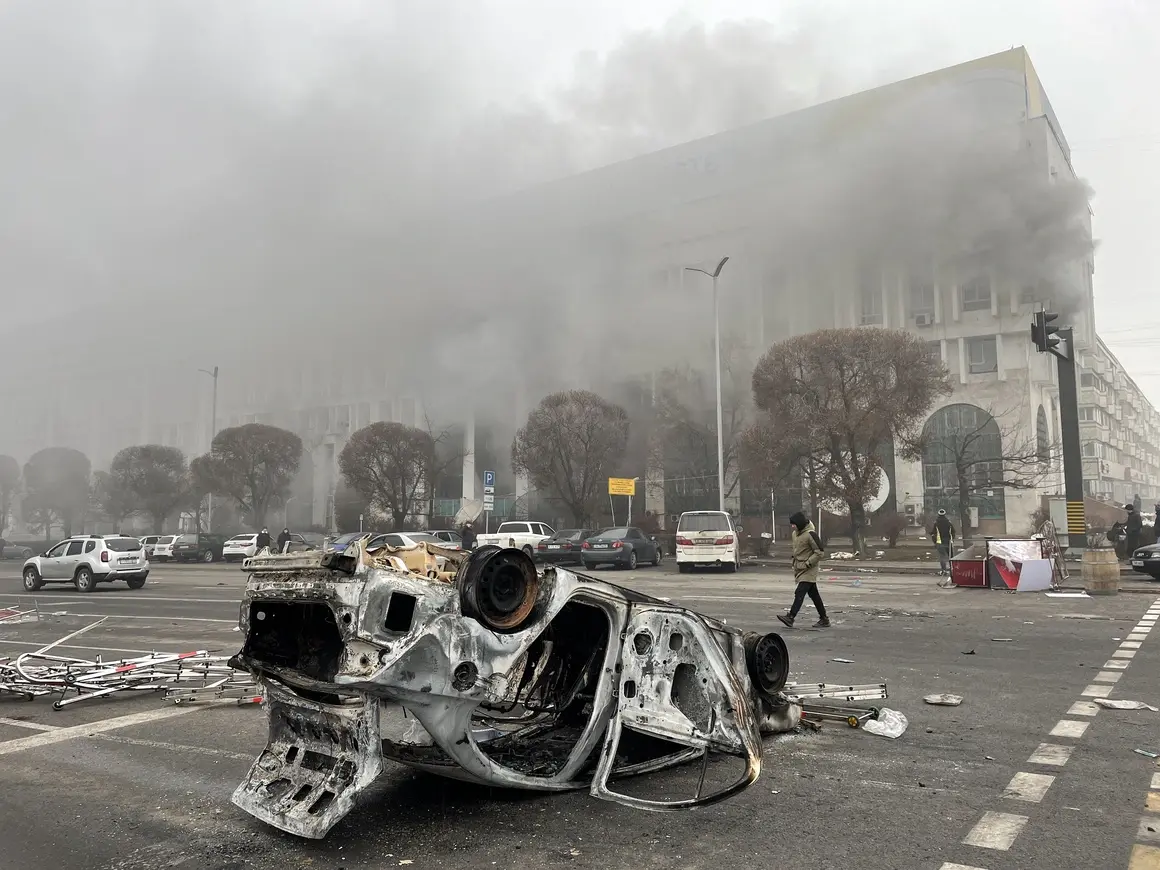 На снимката - сградата на губернаторската управа в Алмати гори след щурма на протестиращите на 5 януари.