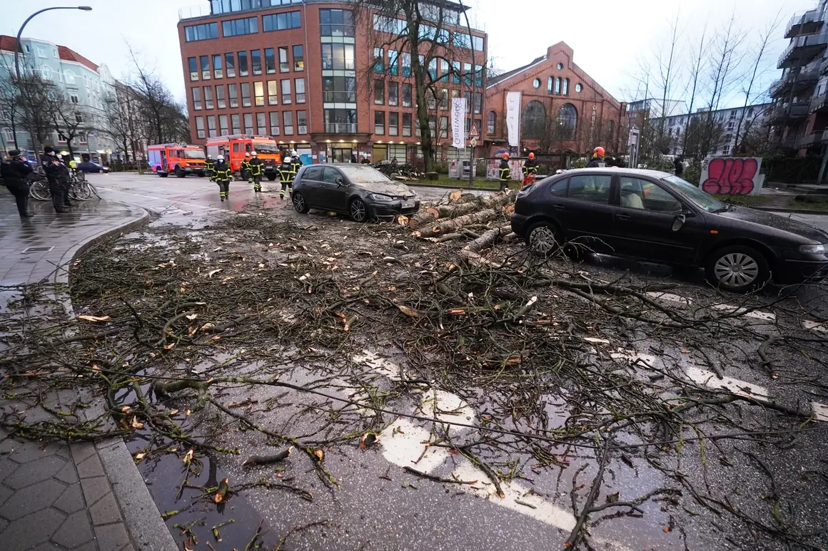 Бурният вятър е съборил дърво върху два автомобила и велосипедист в Хамбург. На снимката, пожарникари режат и разчистват клоните от пътя.