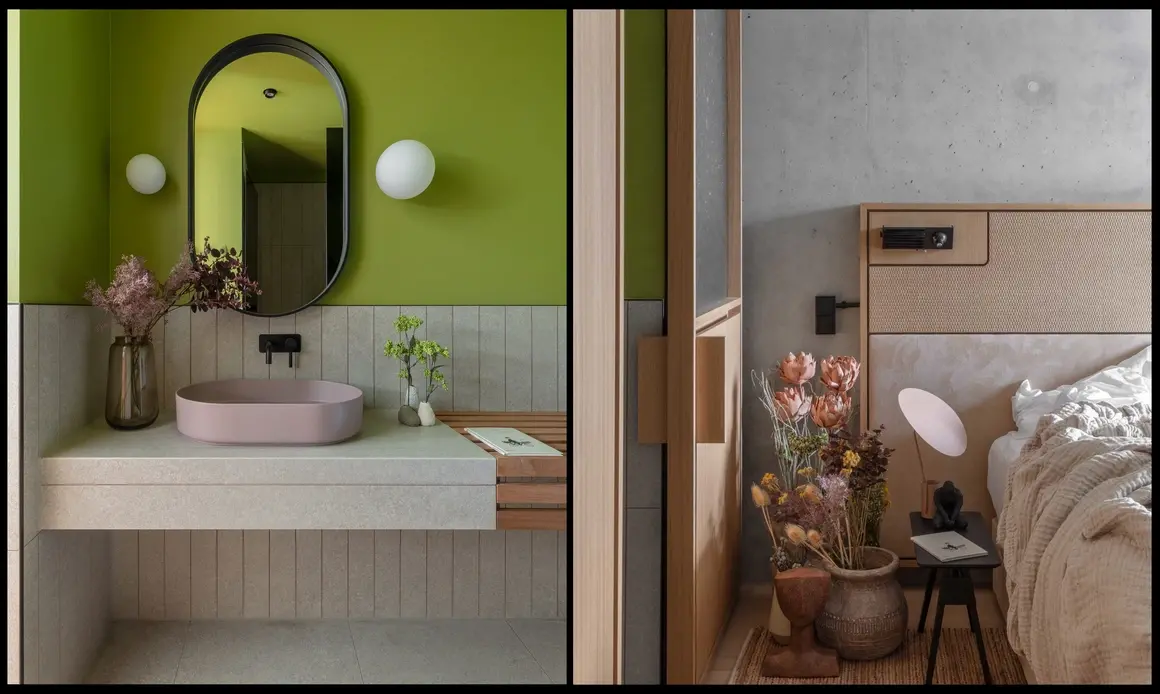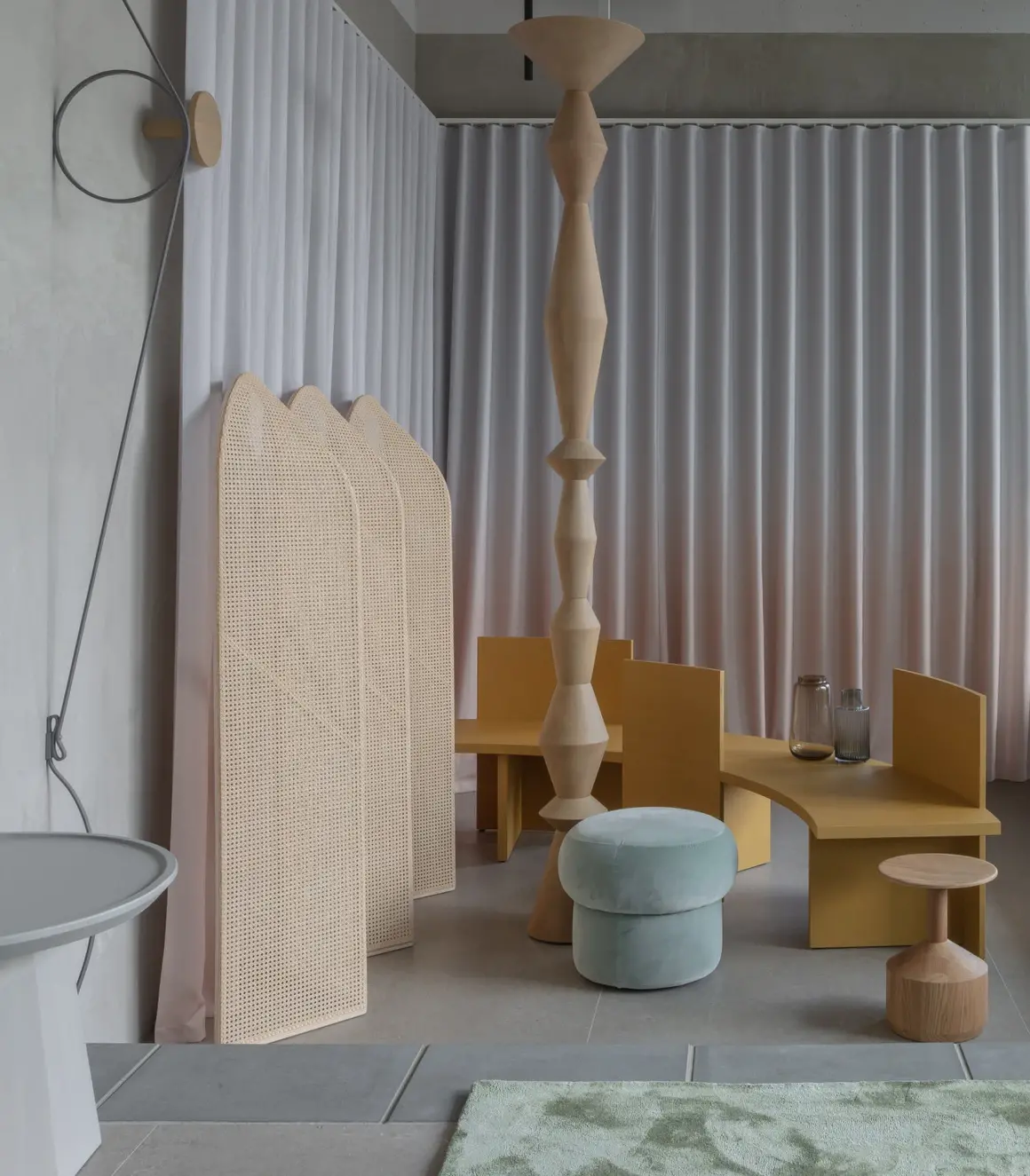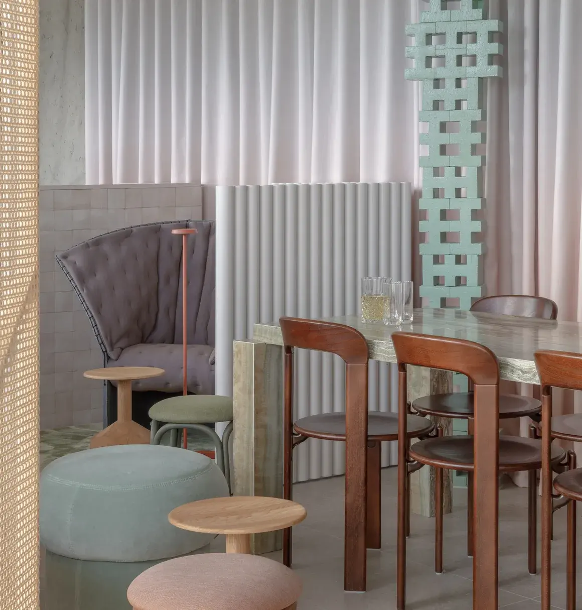 В стаите палитрата от дърво, бетон и текстурирано стъкло е оживена с меки мебели в пастелни цветове, включително столове с цвят куркума, килими тип юта, табли и паравани от велур и ратан.
