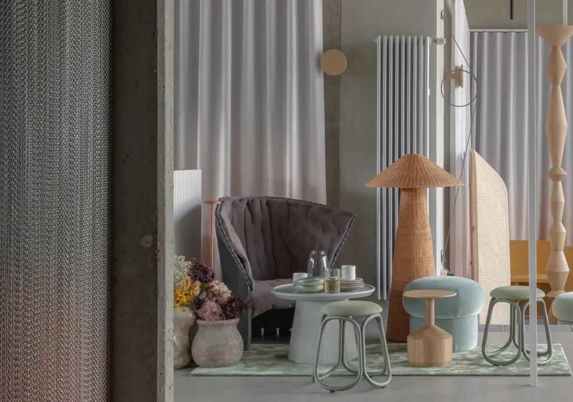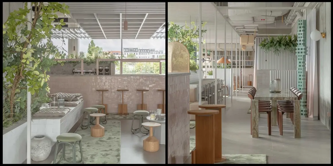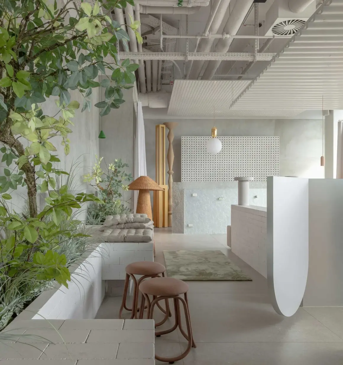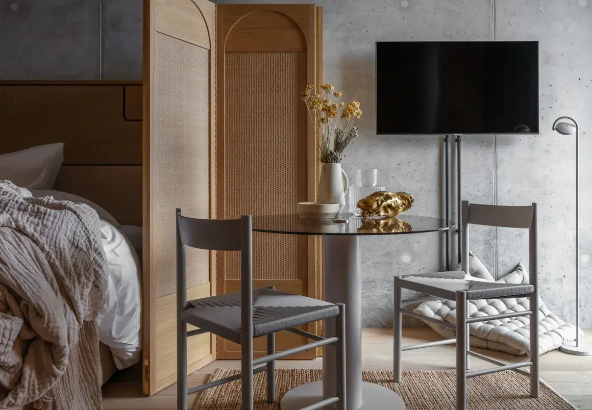 В стаите палитрата от дърво, бетон и текстурирано стъкло е оживена с меки мебели в пастелни цветове, включително столове с цвят куркума, килими тип юта, табли и паравани от велур и ратан.
